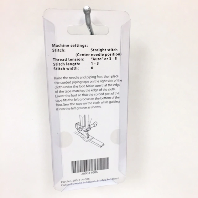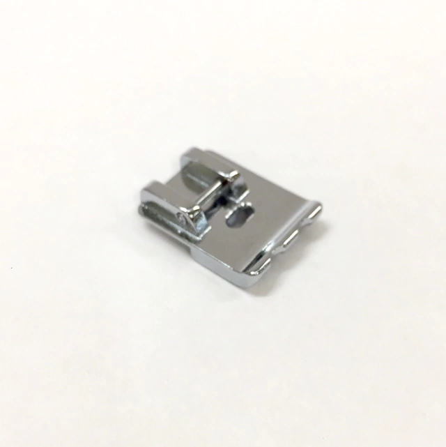 Consta de dos ranuras en la parte inferior que permiten sujetar y cubrir el cordón con la cinta, a medida que avanza la costura.