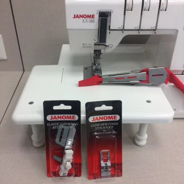 Incluye el accesorio para guiar y dar tensión al elástico mientras se cose y un prensatela transparente para que veas el lugar donde va a quedar la costura.